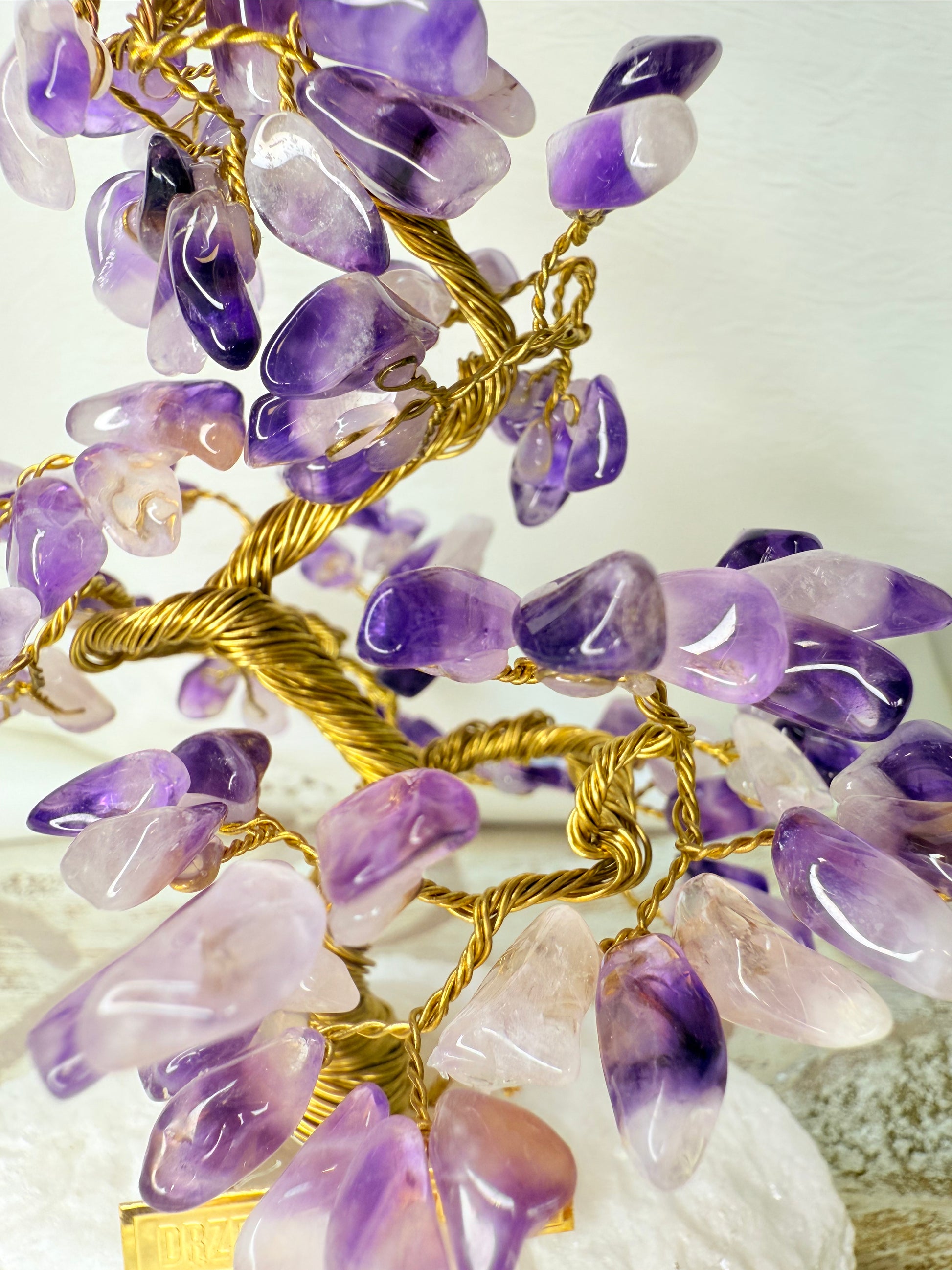 Arbre du bonheur AMETHYSTE,une pièce artisanal entièrement façonnée a la main par un couple d’artisans passionnés. Chaque détail est travaillé avec soin: des racines délicatement sculptées jusqu’aux branches finement torsadées.