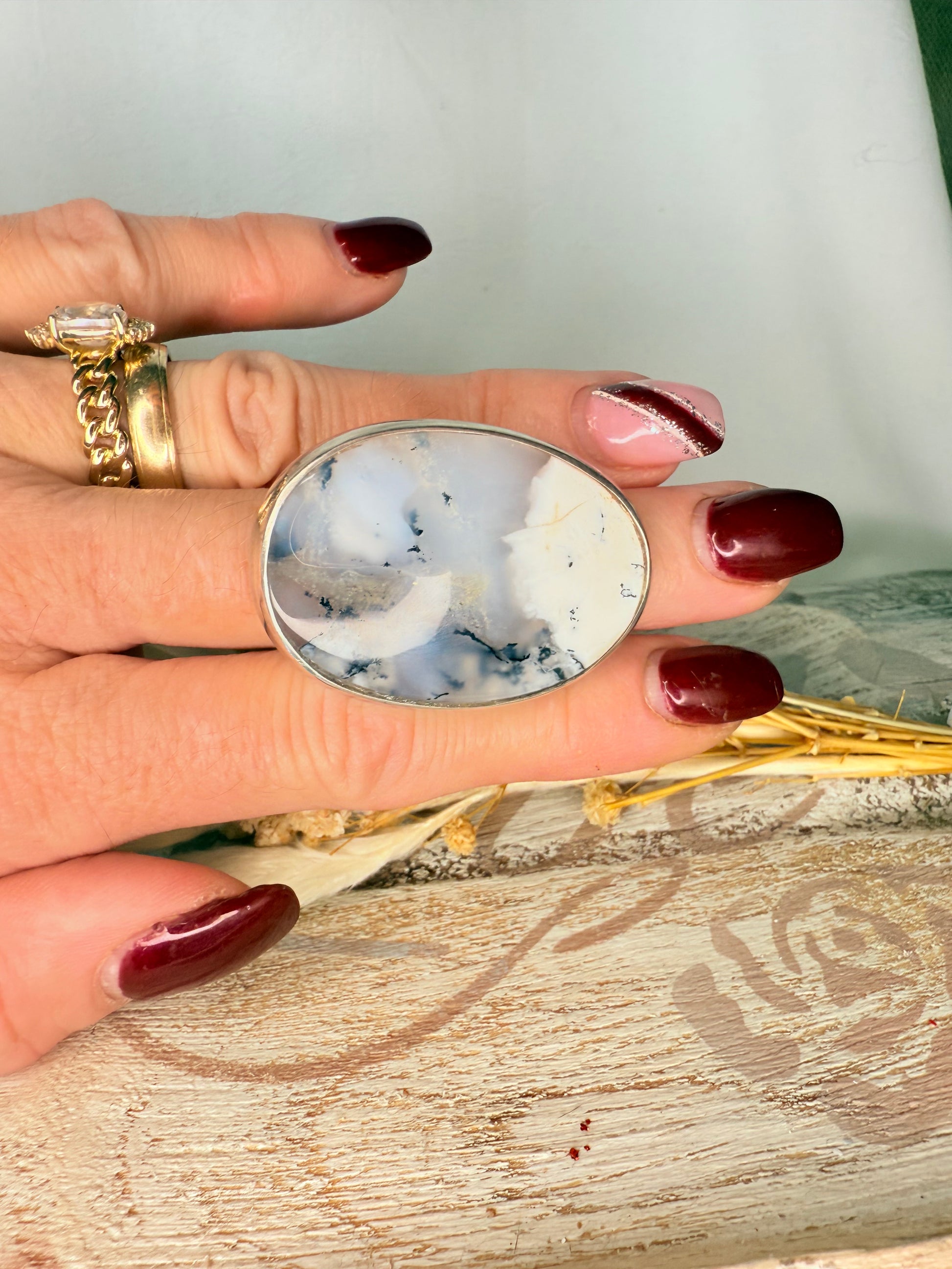 Unique et pleine de charme naturel, cette bague en argent 925 met en valeur une magnifique agate dendritique, reconnue pour ses inclusions sombres rappelant de délicates branches ou paysages enneigés. Chaque pierre est une véritable œuvre d’art de la nature, offrant des motifs uniques et impossibles à reproduire.