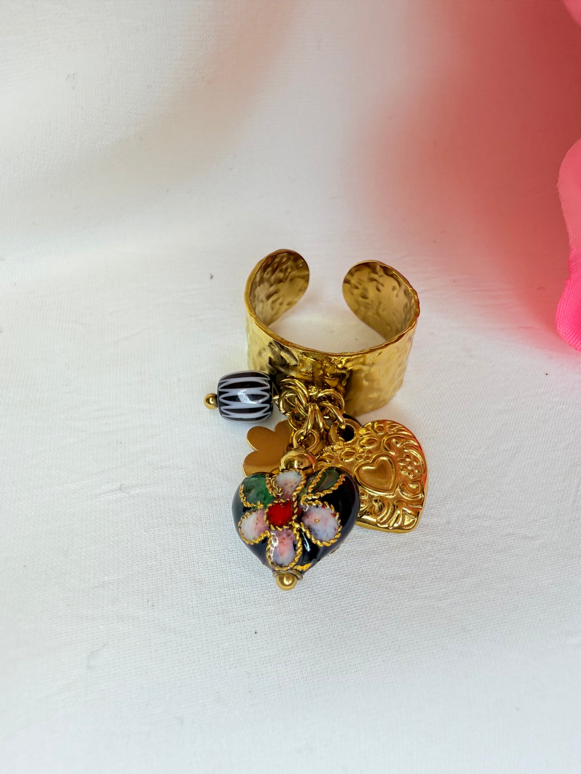 Bague IRINA, l’alliance est tout martelé et nous offre plusieurs petites breloques.