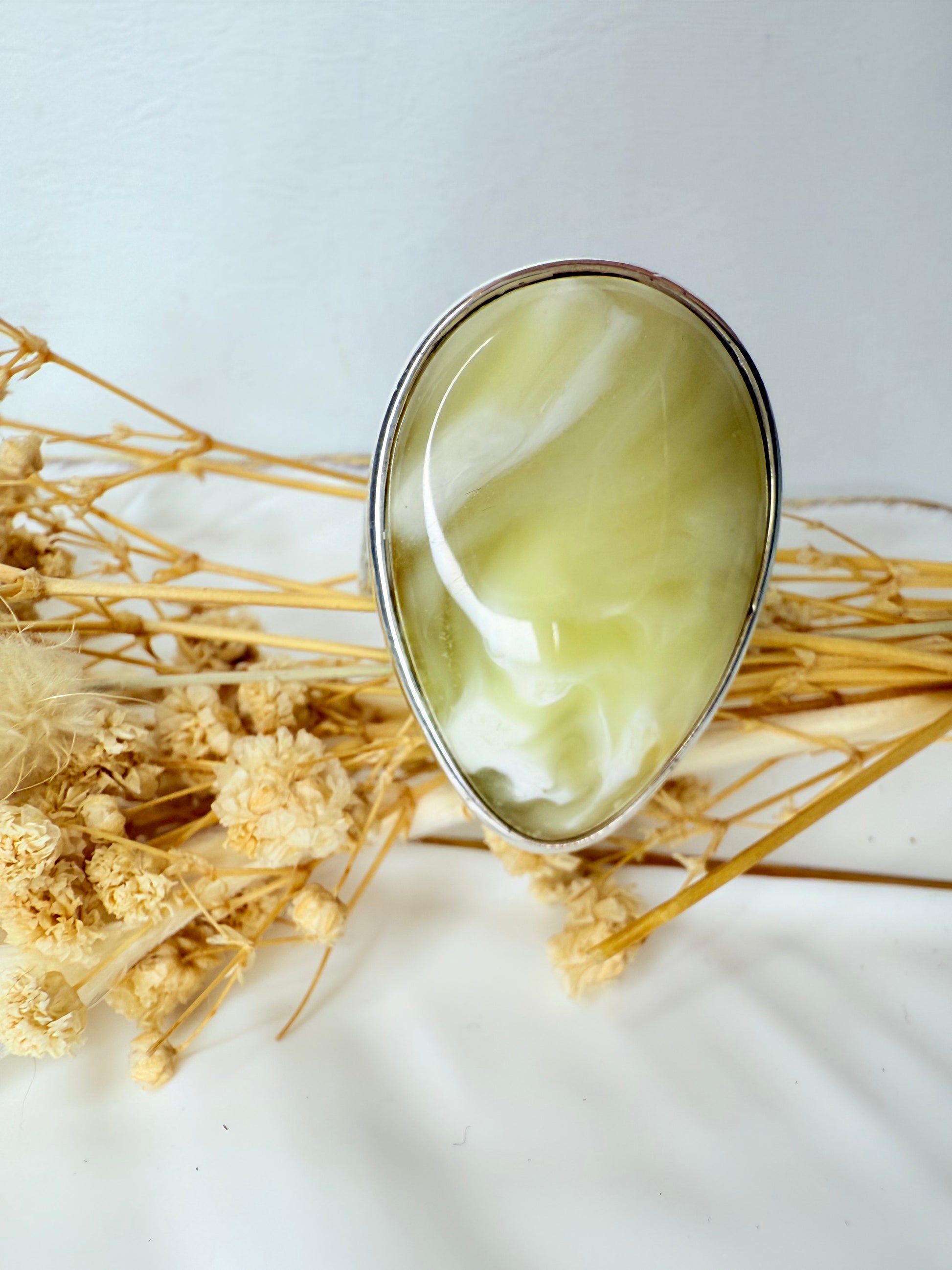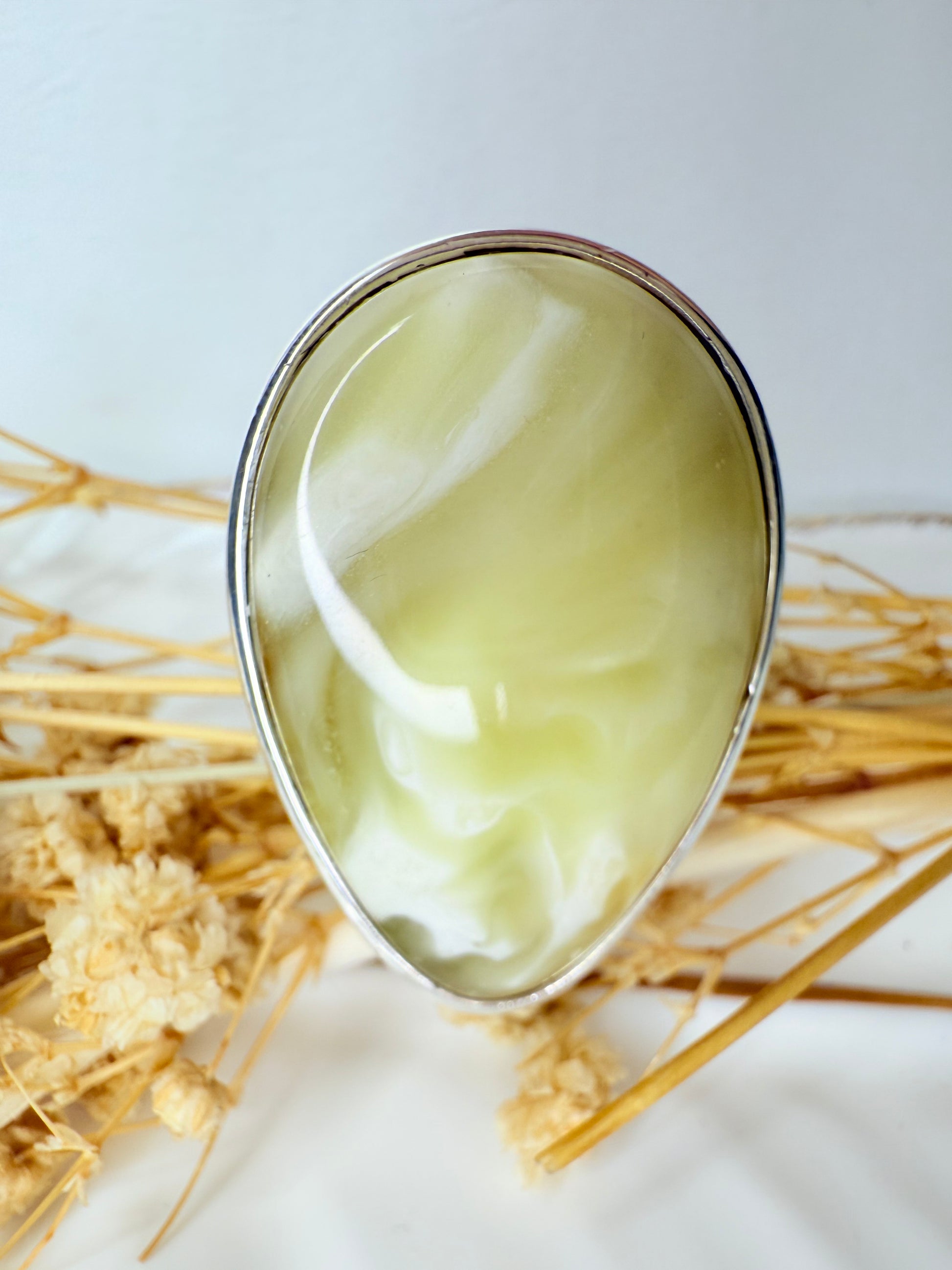 Montée sur un anneau en argent 925 martelé, elle associe l’authenticité de l’ambre à la sophistication d’un travail artisanal.