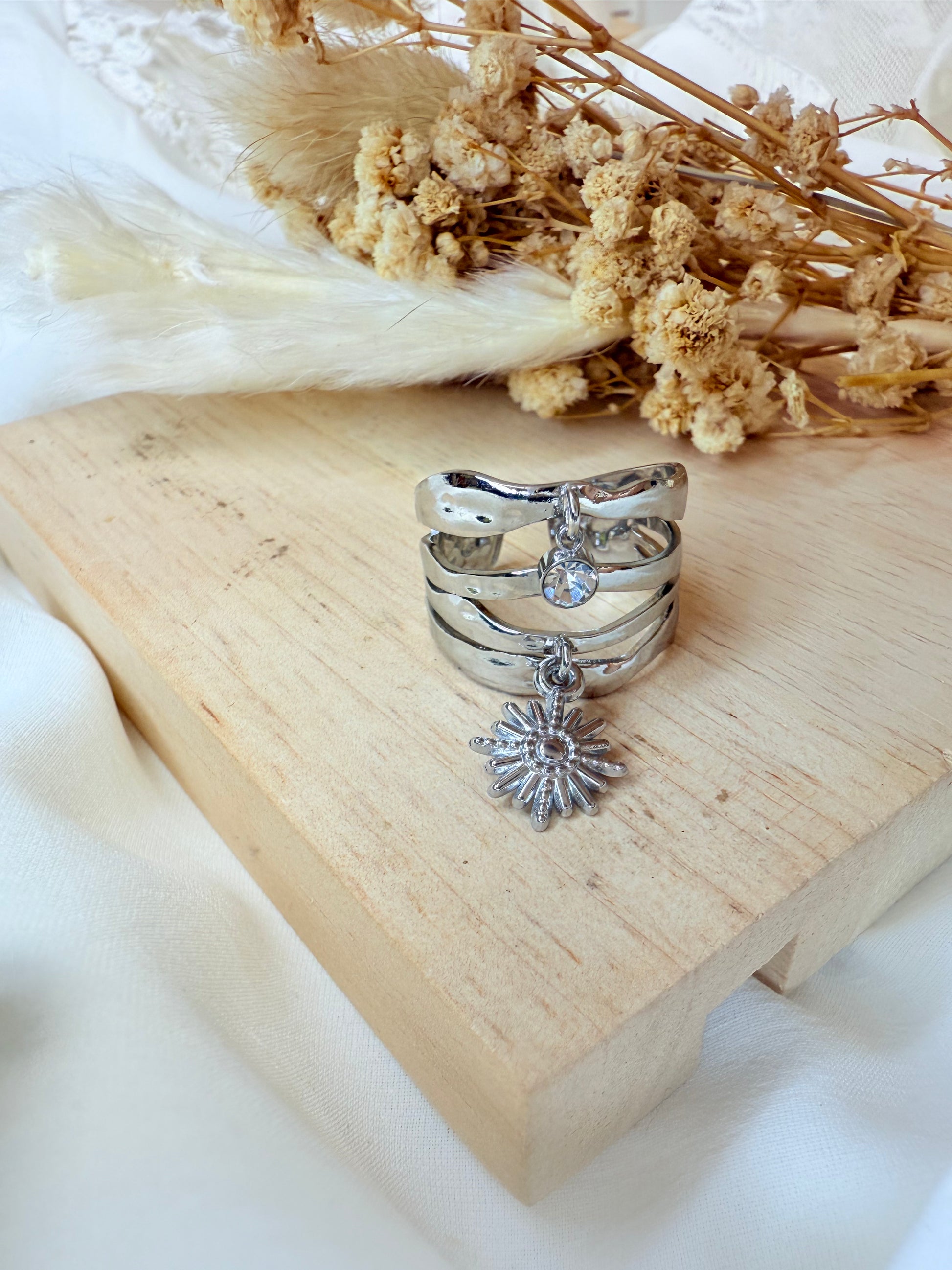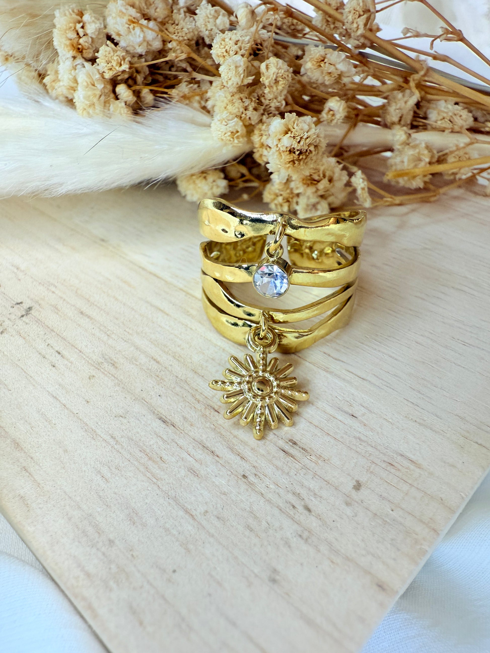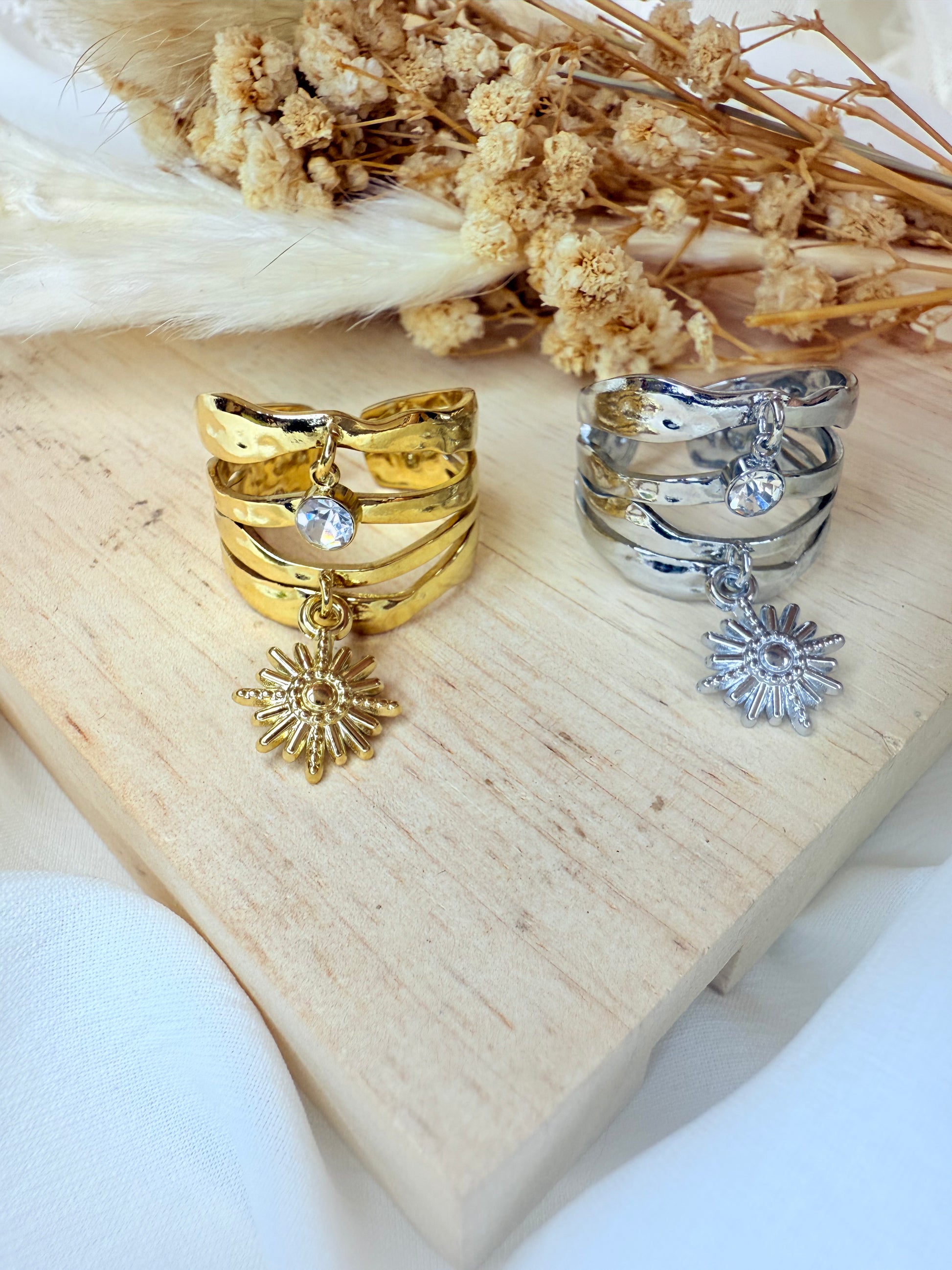 Cette bague à trois rangs délicatement entrelacés incarne l’élégance moderne et la féminité subtile. L’un des anneaux est orné d’une petite étoile en breloque, tandis qu’un autre se pare d’un fin et délicat cristal rappelant la beauté d’un ciel étoilé.