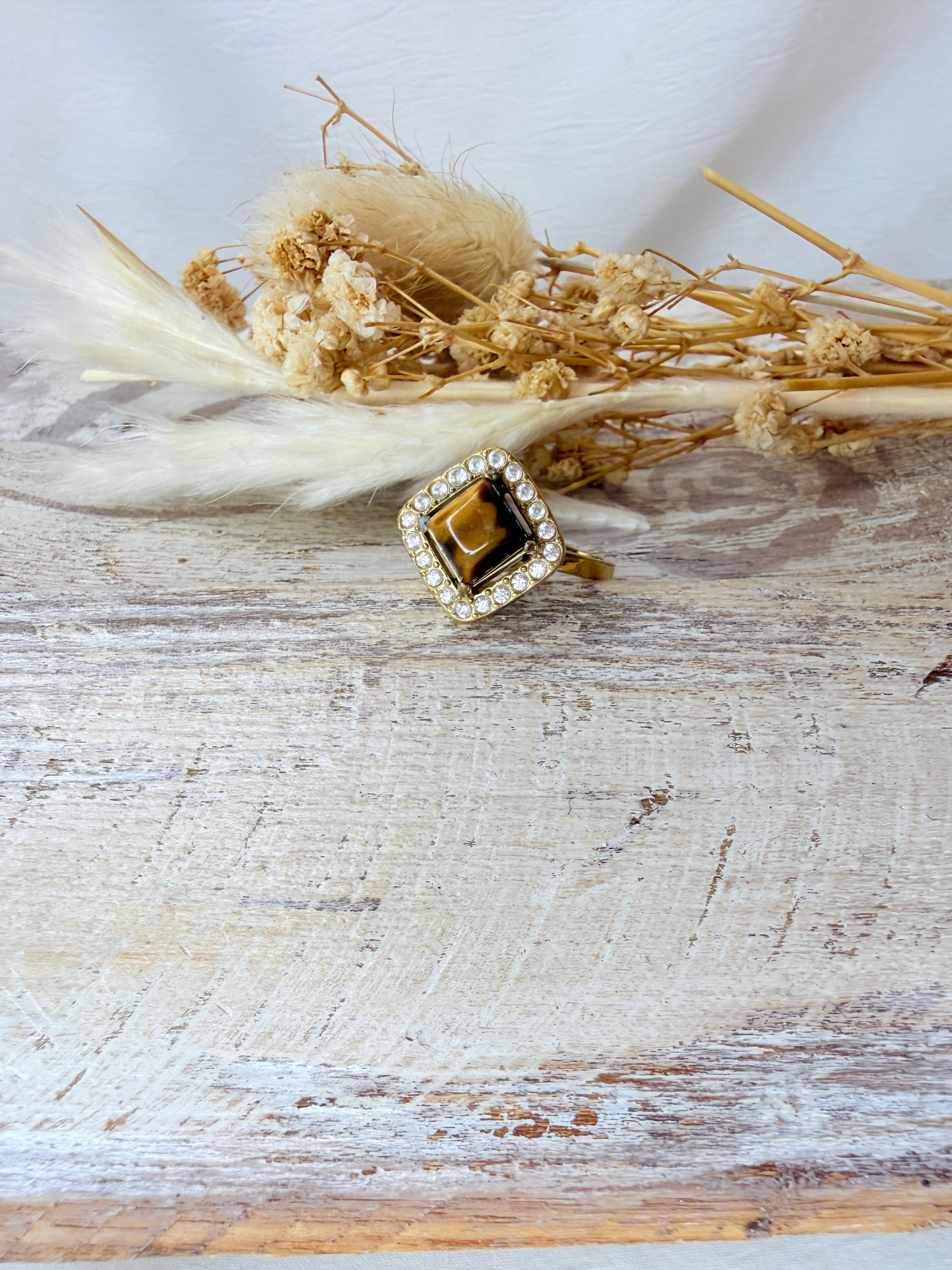 Bague ornée d’une pierre œil du tigre naturelle.