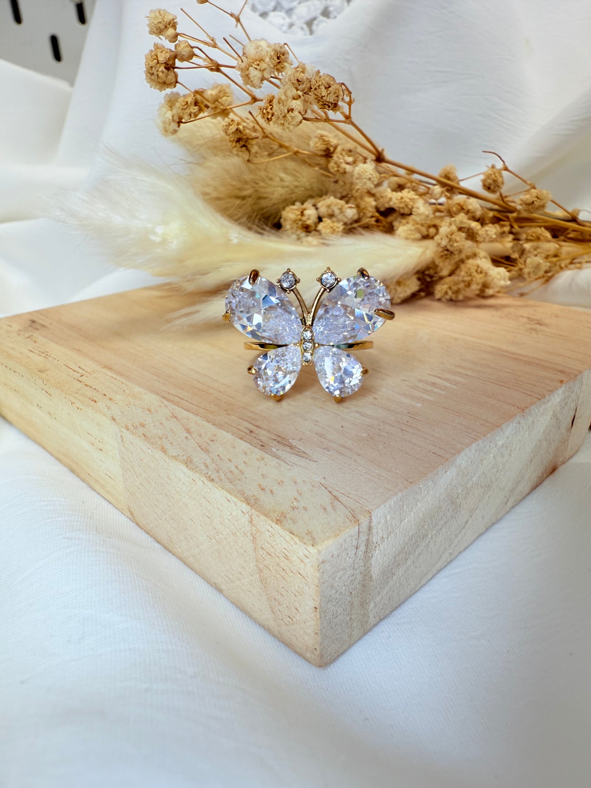 Une création raffinée qui capture la légèreté et la grâce du papillon. Son anneau délicat accueille un papillon aux ailes serties de cristaux scintillants, reflétant la lumière à chaque mouvement. Symbole de liberté et de transformation, cette bague allie éclat et élégance, idéale pour sublimer toutes les tenues avec une touche de poésie.