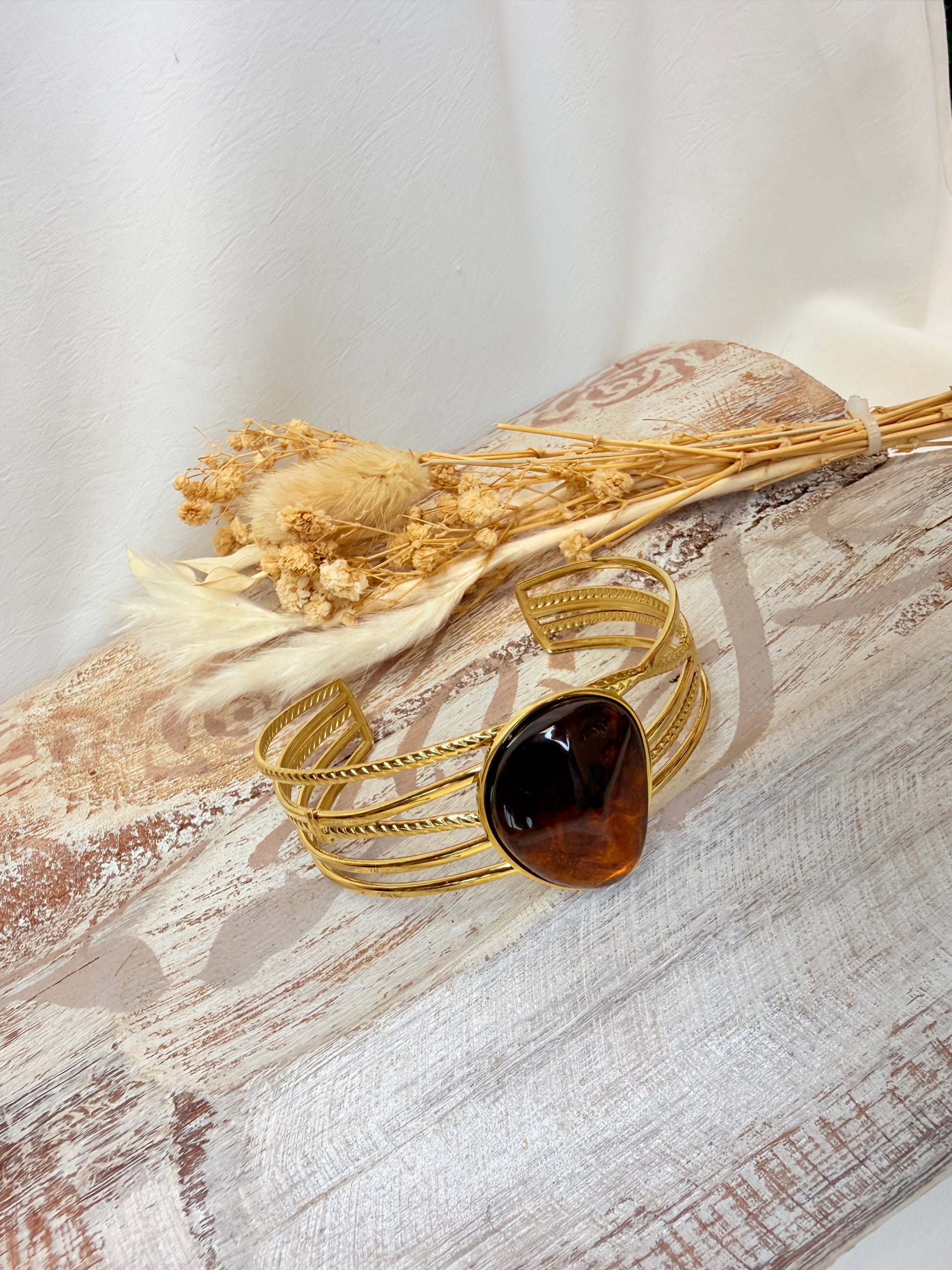 Bracelet manchette élégant, doté d’une pierre couleur ambrée idéal pour sublimer un look quotidien ou une tenue de soirée.