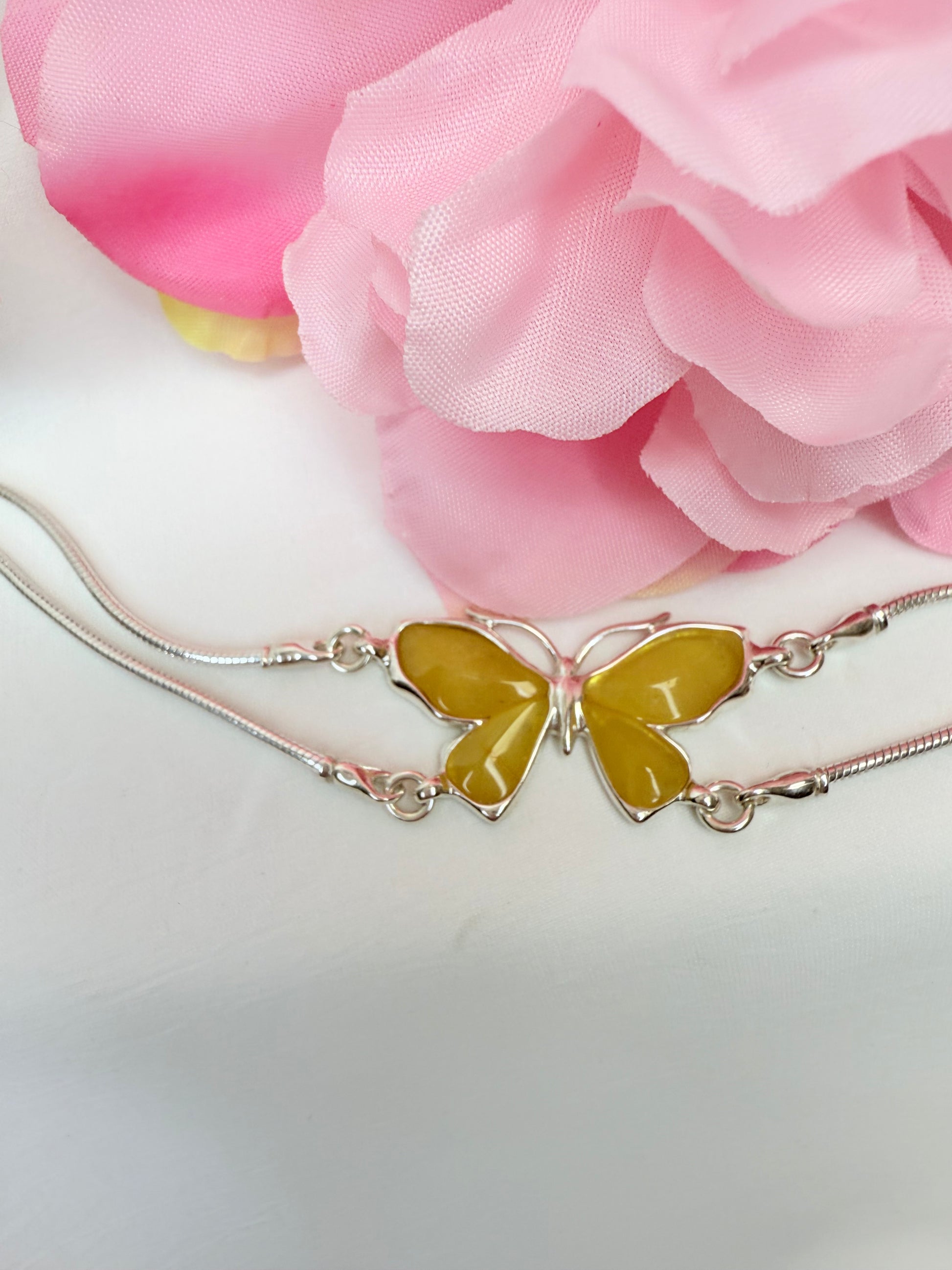 Ce joli papillon, élégant et raffiné, est un mariage de l’argent 925 avec l’ambre.