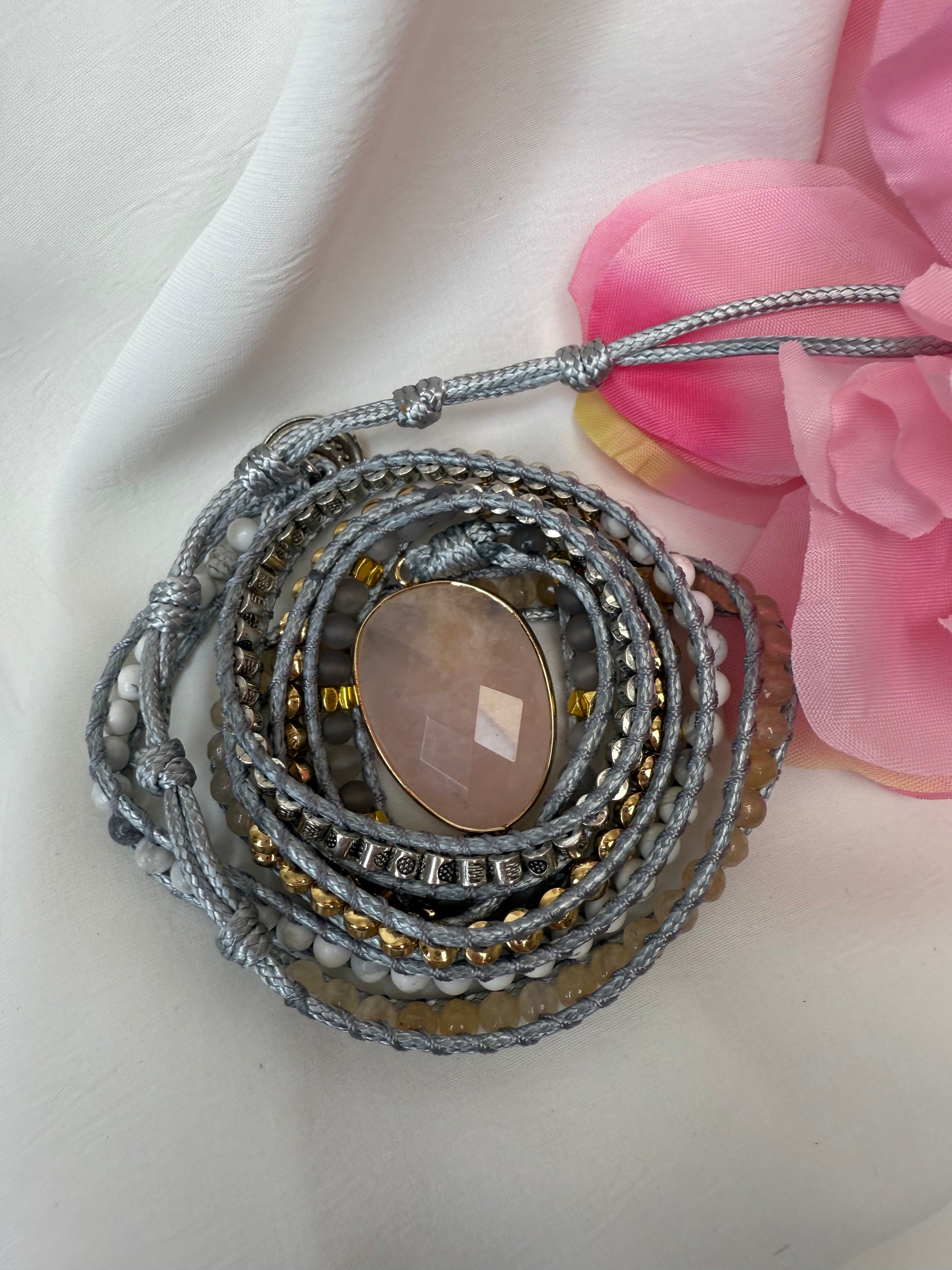 Bracelet style Boheme, tout en pierre naturelles, Quartz rose, Howlight, Pierre de Soleil et Hématite.