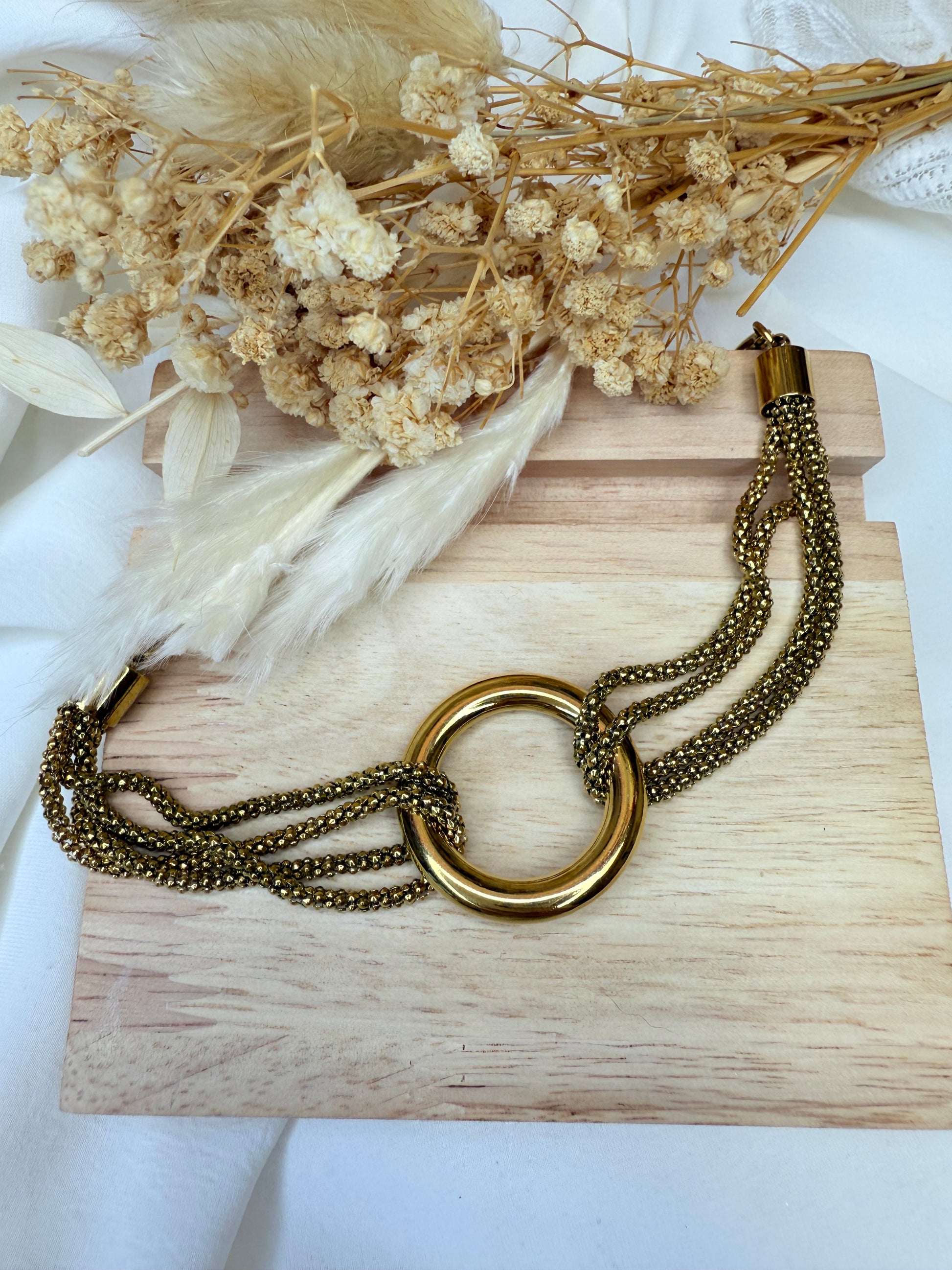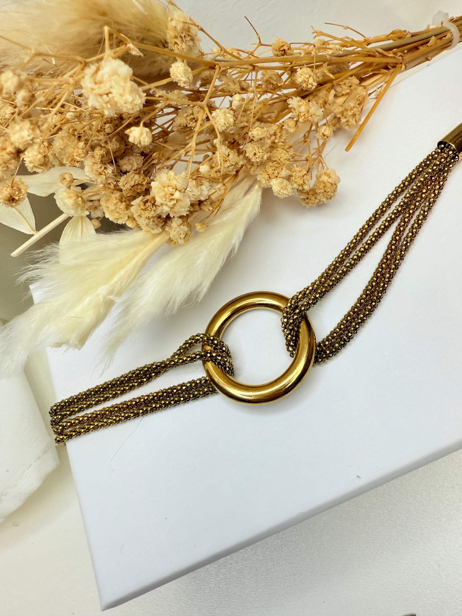 Bracelet raffiné composé d’un rond central, symbole d’unité et d’éternité, maintenu par deux double chaînes à maillons ronds. Son design minimaliste et harmonieux offre une touche de sobriété chic, idéale pour un style à la fois moderne et intemporel.