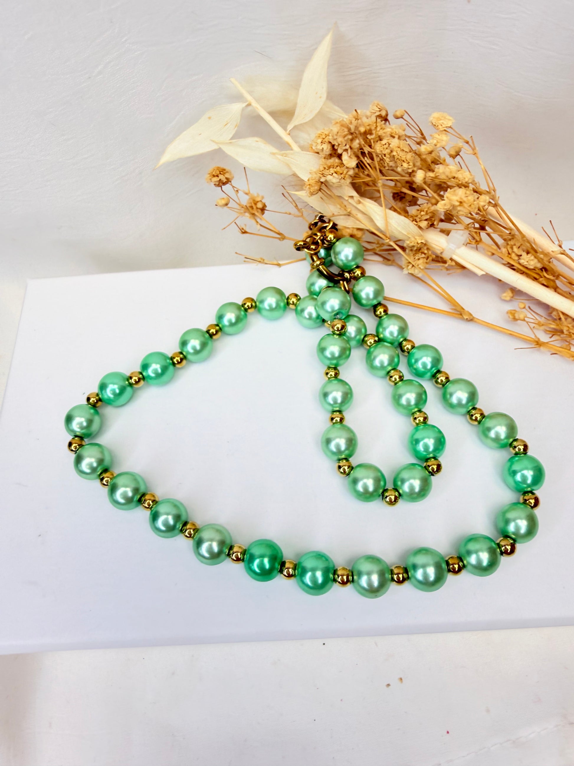 Collier tout en perle de couleur verte, avec le fermoir « bouée « idéale pour y ajouter des charms