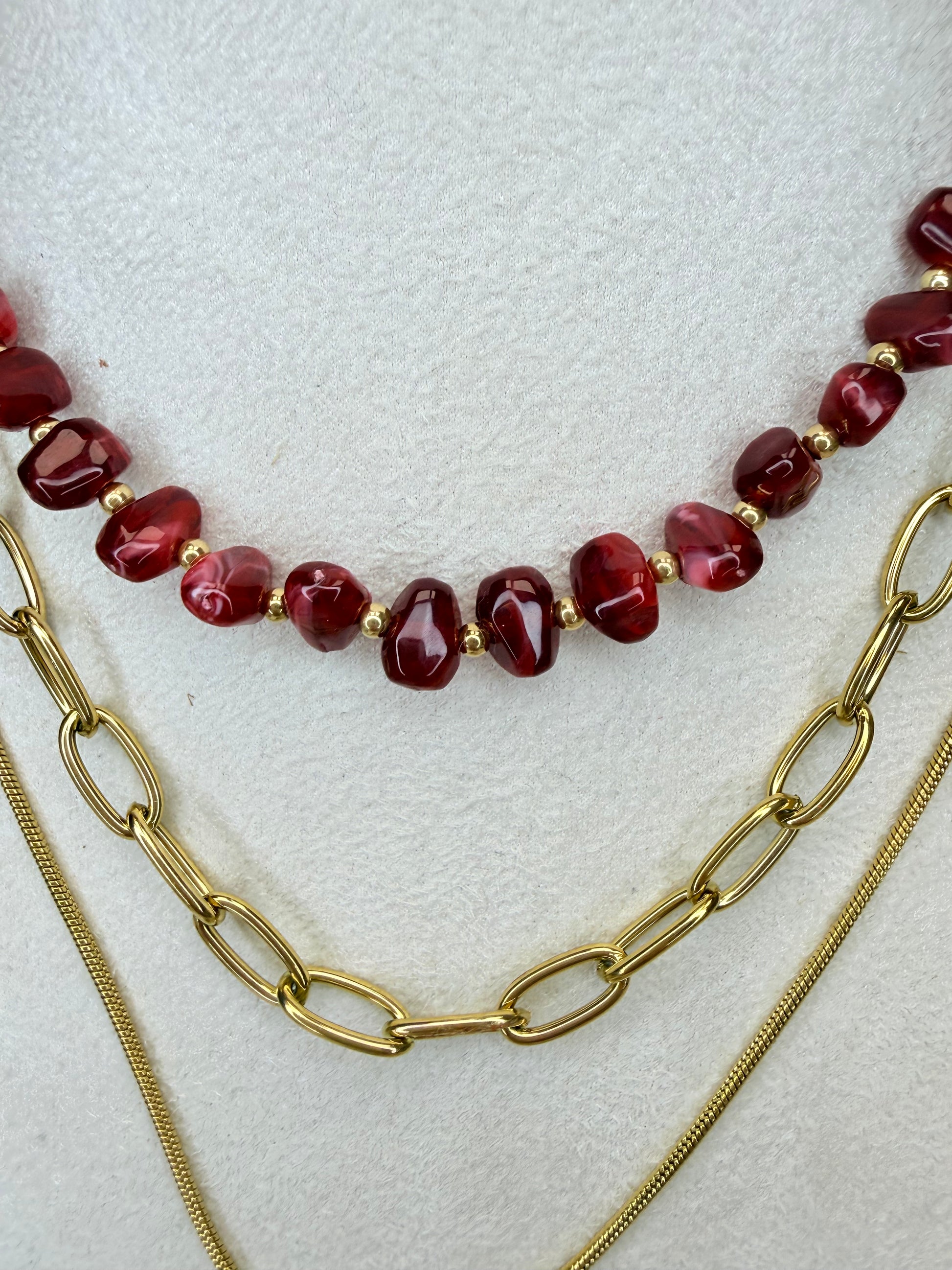Collier à trois rangs aux chaînes variées, dont une agrémentée de perles en résine couleur bordeaux.