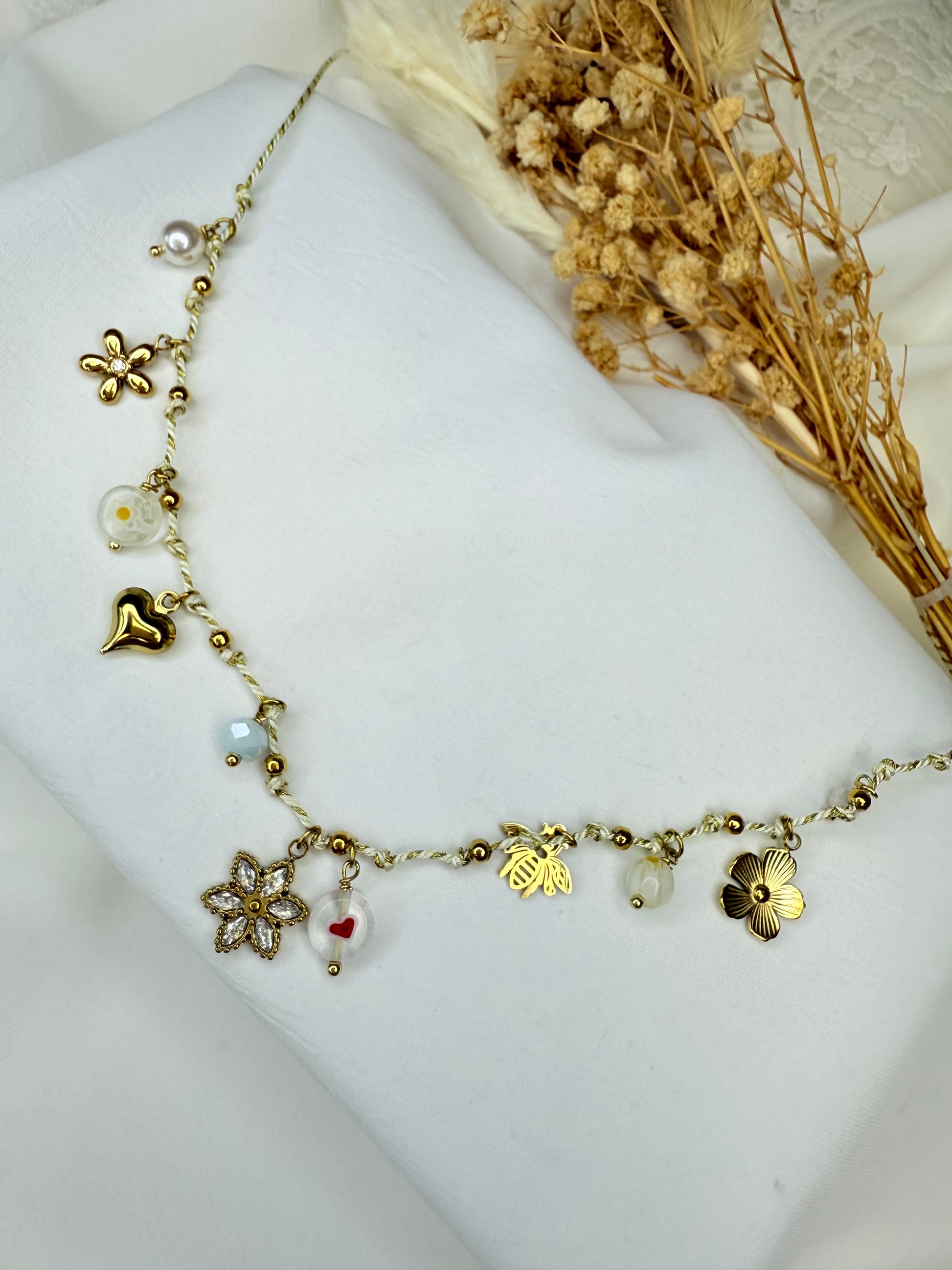 Collier aérien monté sur un fil blanc délicat, orné de petites pampilles fines et lumineuses. Sa légèreté et sa transparence lui confèrent un effet délicat et raffiné, comme suspendu sur la peau.