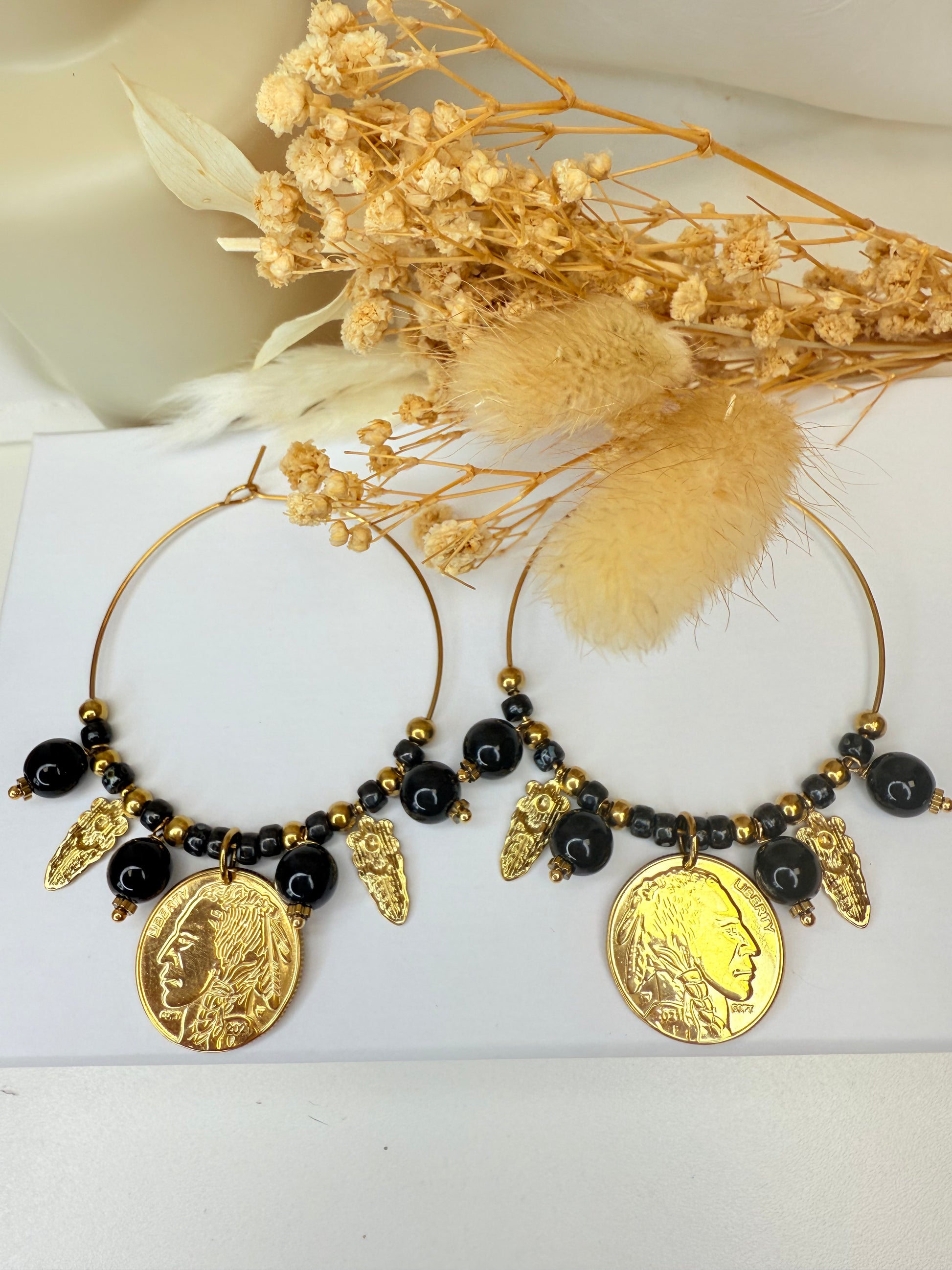 Laissez-vous séduire par ces créoles au charme ethnique et raffiné, ornées d’une médaille dorée gravée d’un visage d’Indien.