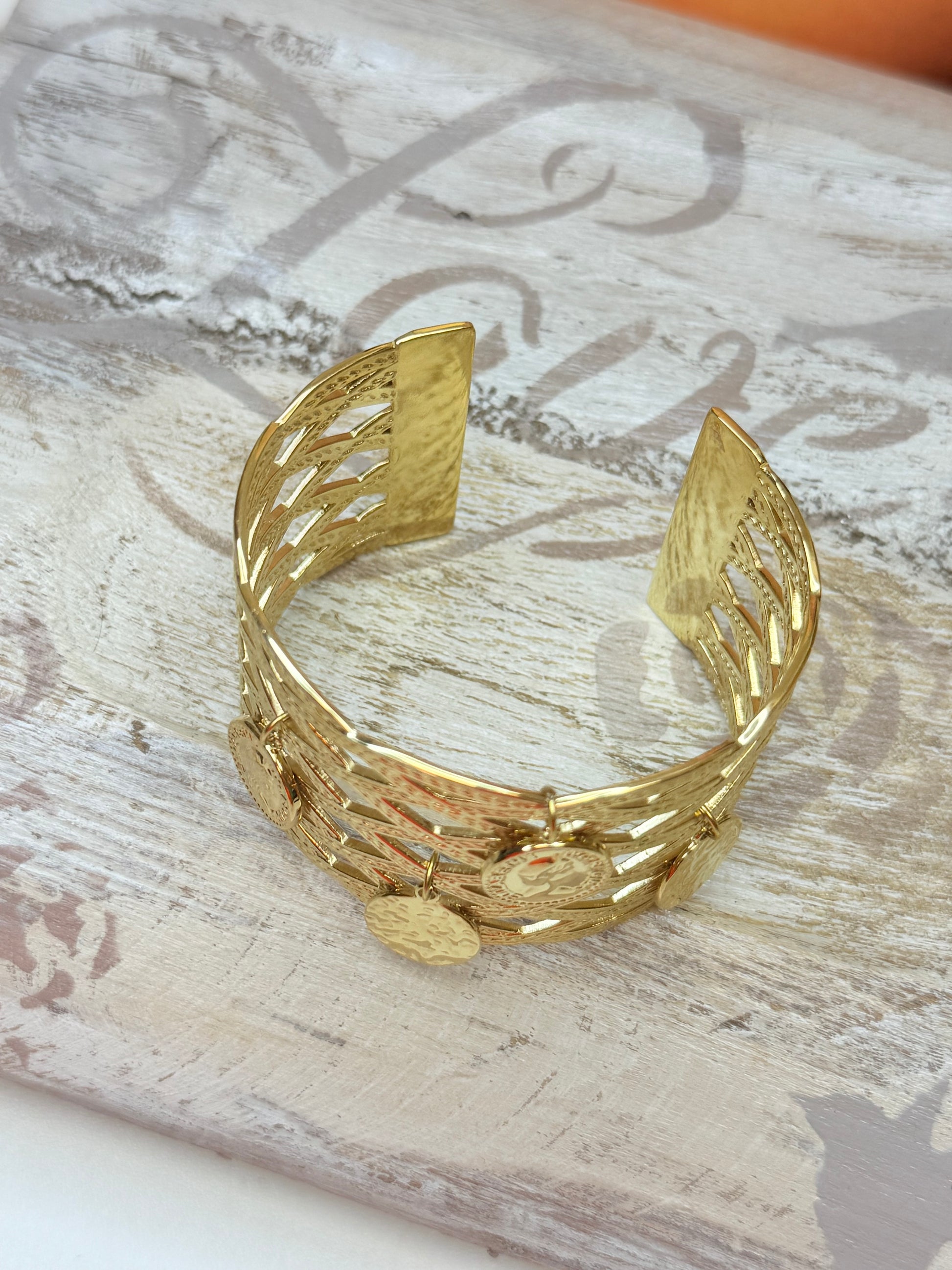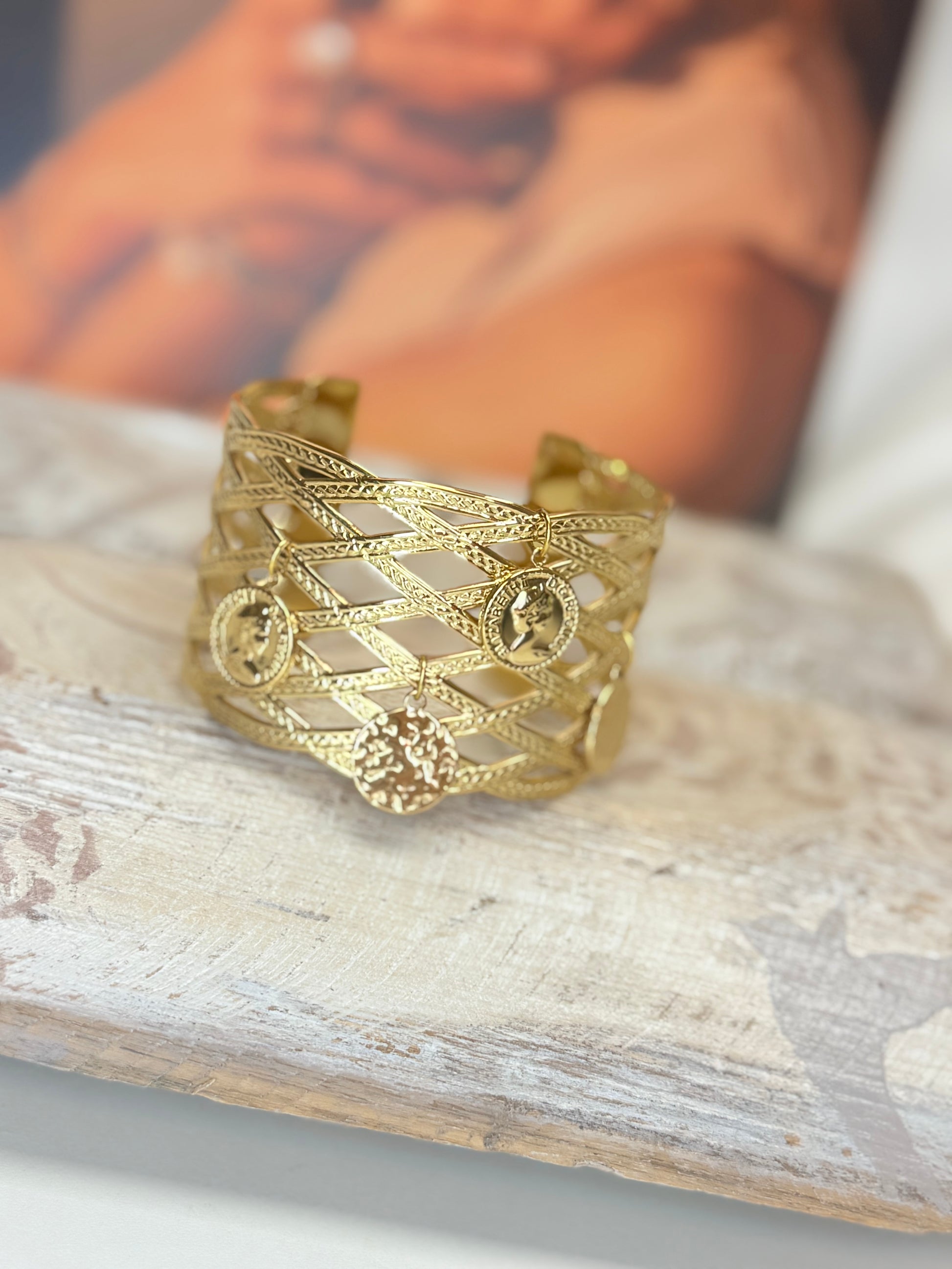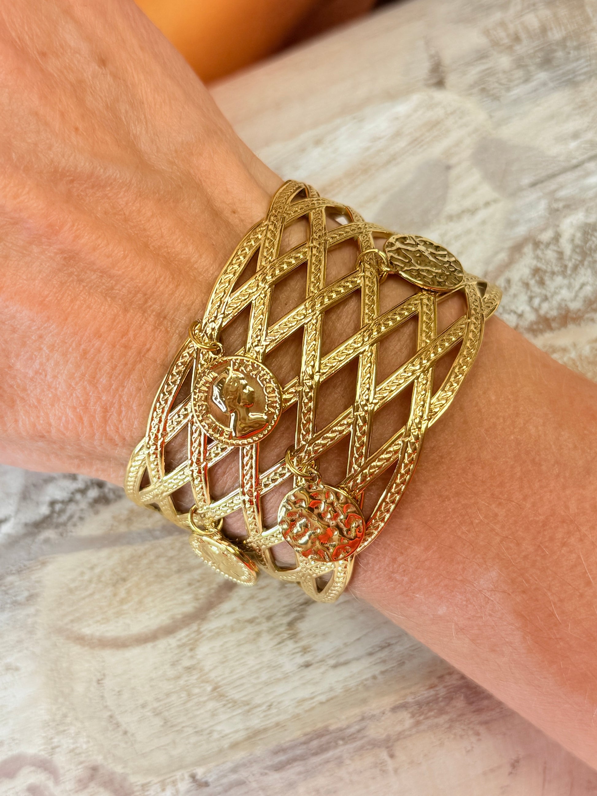 Manchette large au motif quadrillé, rehaussée de petites piécettes délicatement posées en surface.