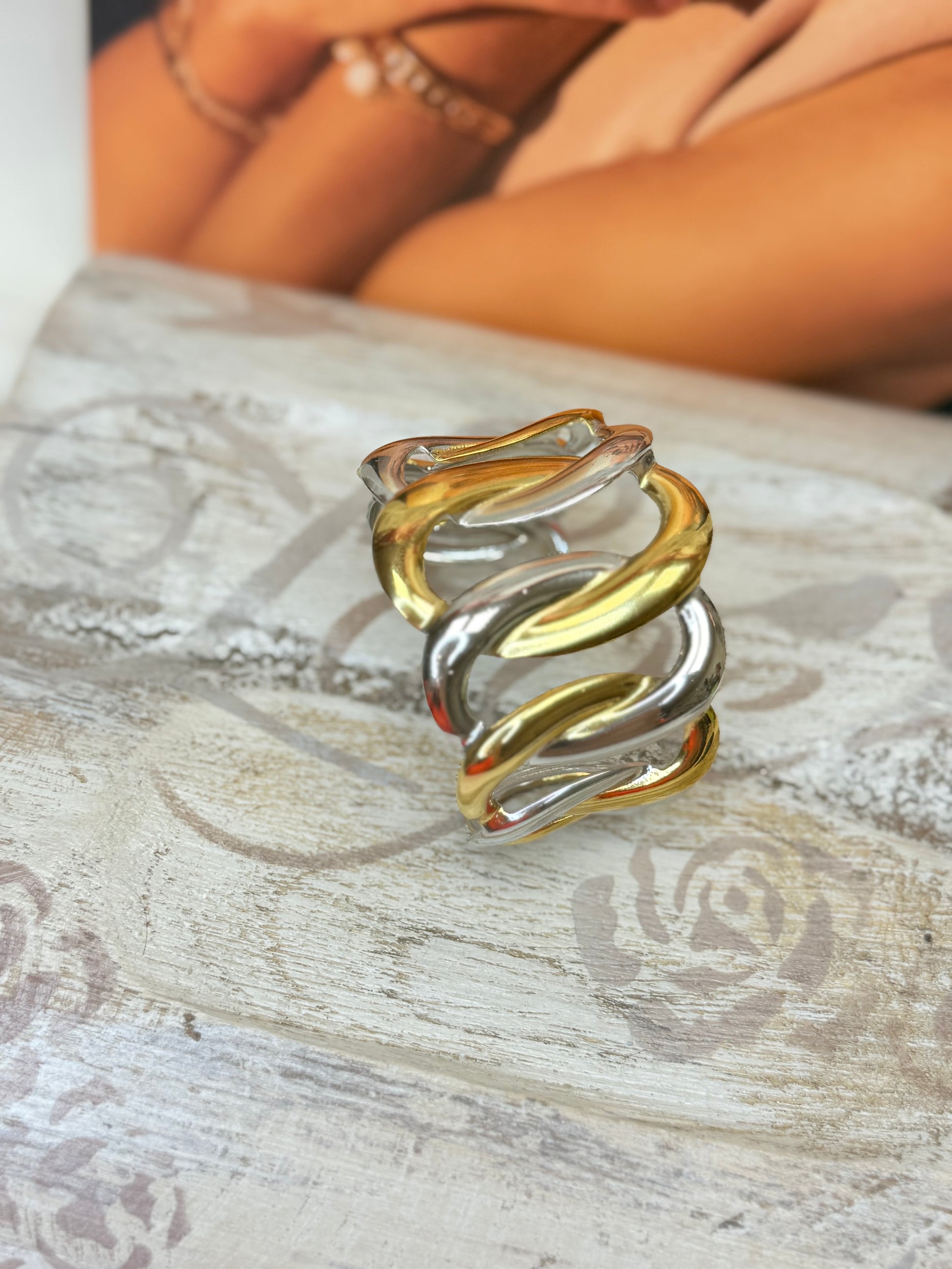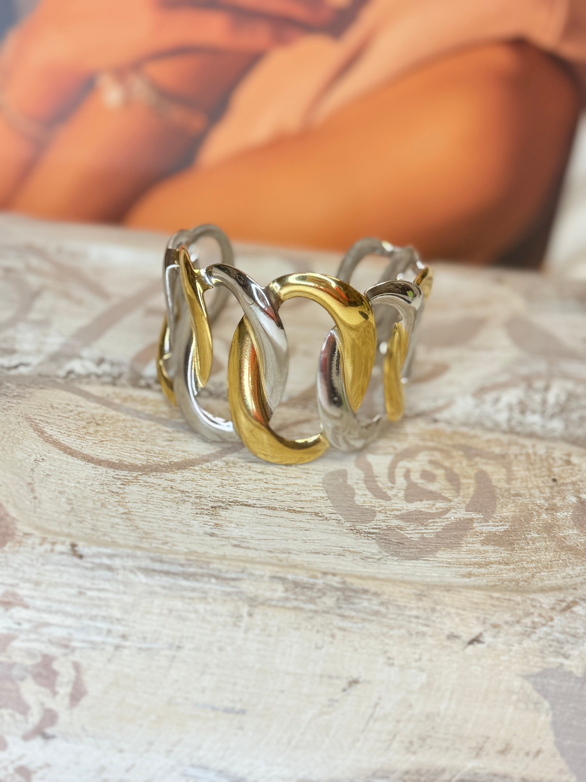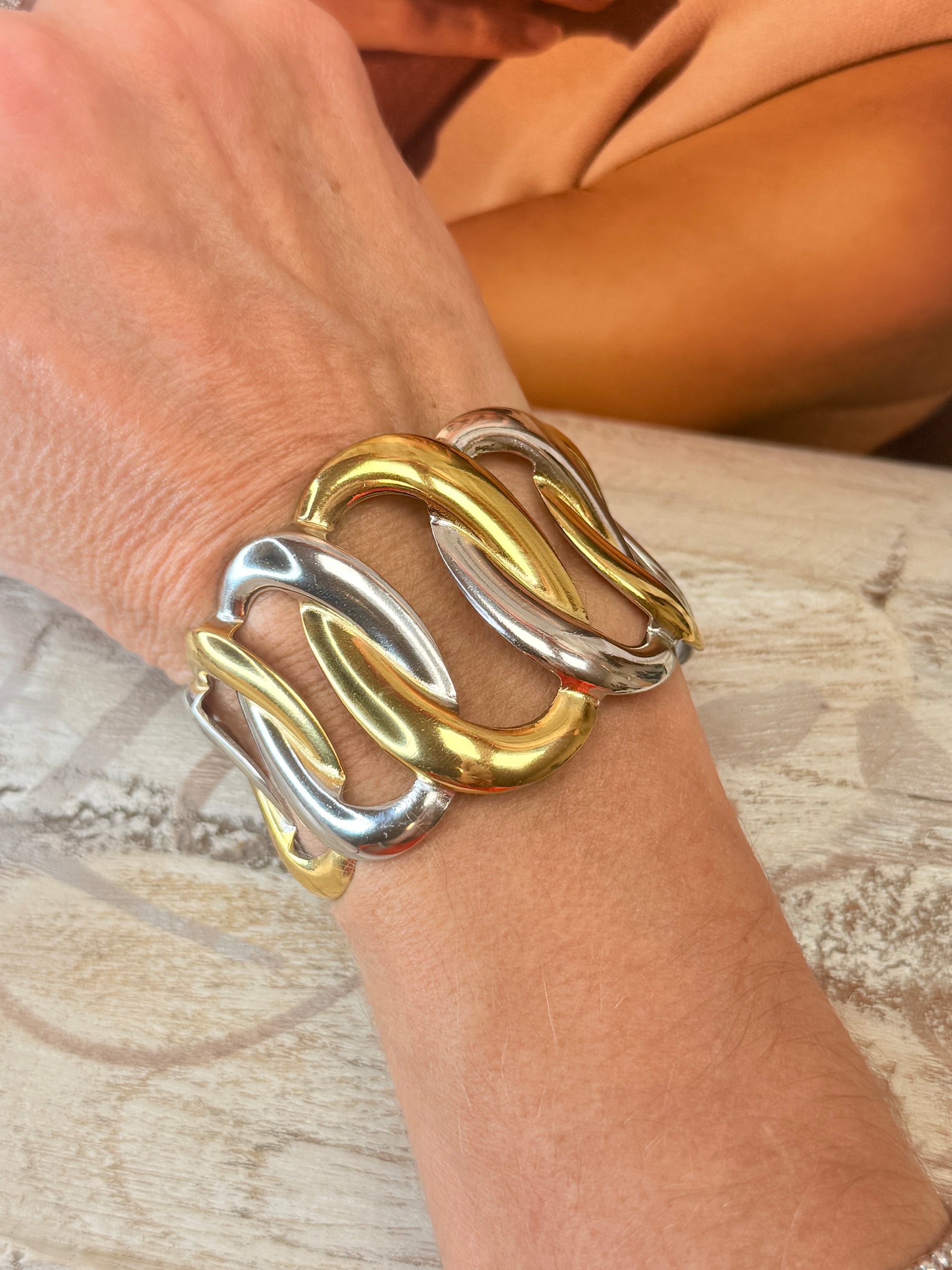 Manchette large mêlant harmonieusement les tons argentés et dorés.