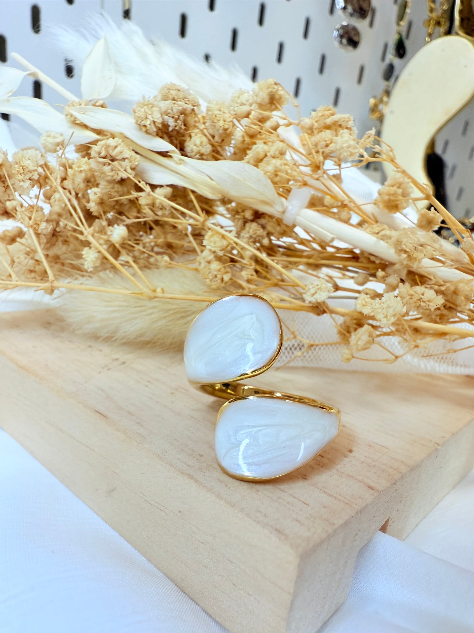 Bague couleur blanc pastel, en forme de deux pétales délicatement sculptés. Un bijou à la fois moderne et intemporel, idéal pour ajouter une touche de fraîcheur et d’élégance à votre tenue.