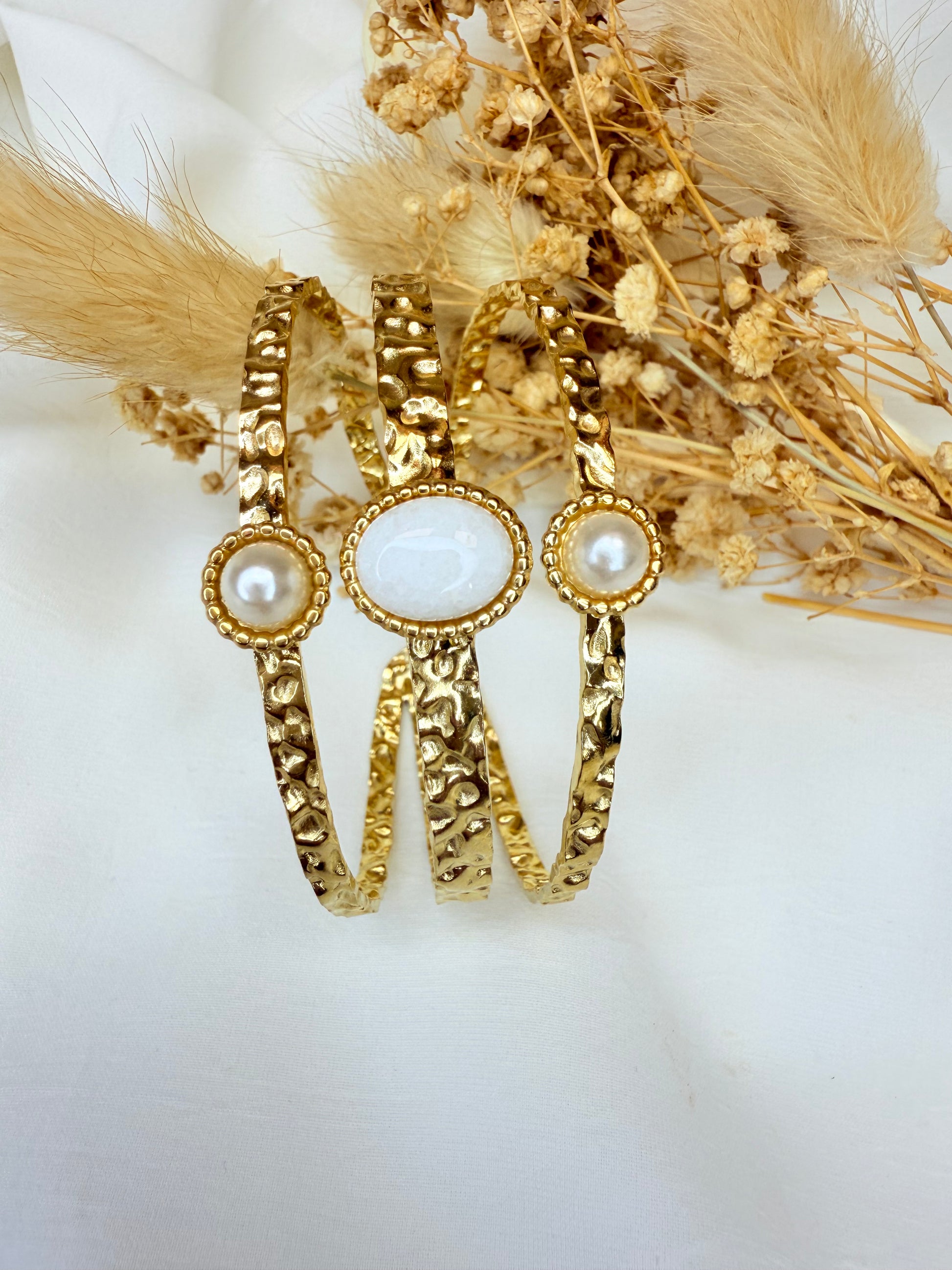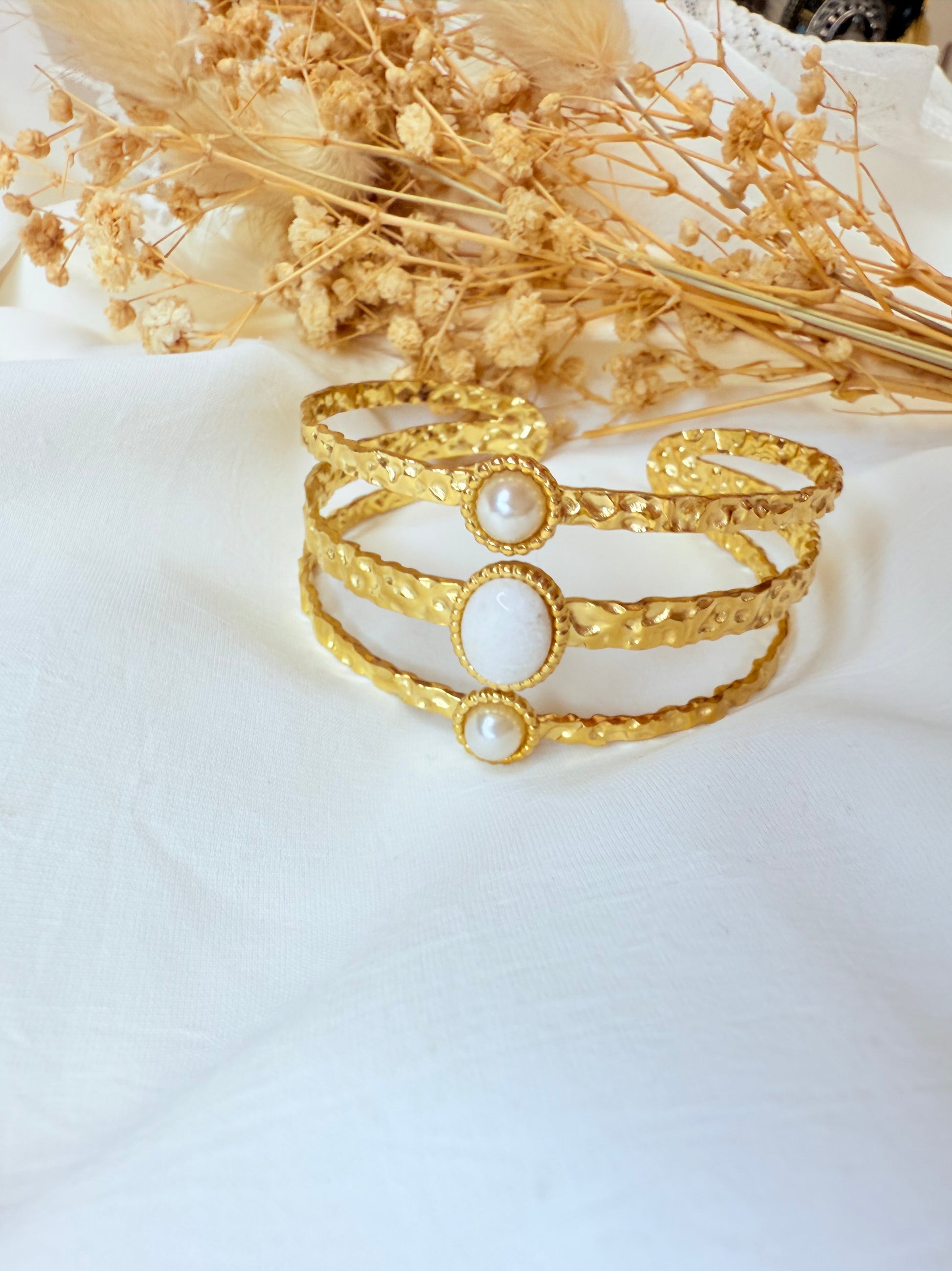 Élégante manchette à trois rangs en métal martelé, sublimée par deux perles délicates et une pierre de couleur éclatante en son centre. Son design à la fois raffiné et audacieux allie textures artisanales et éclats lumineux, pour un bijou qui attire le regard en toute subtilité. Parfaite pour rehausser une tenue de jour comme de soirée.