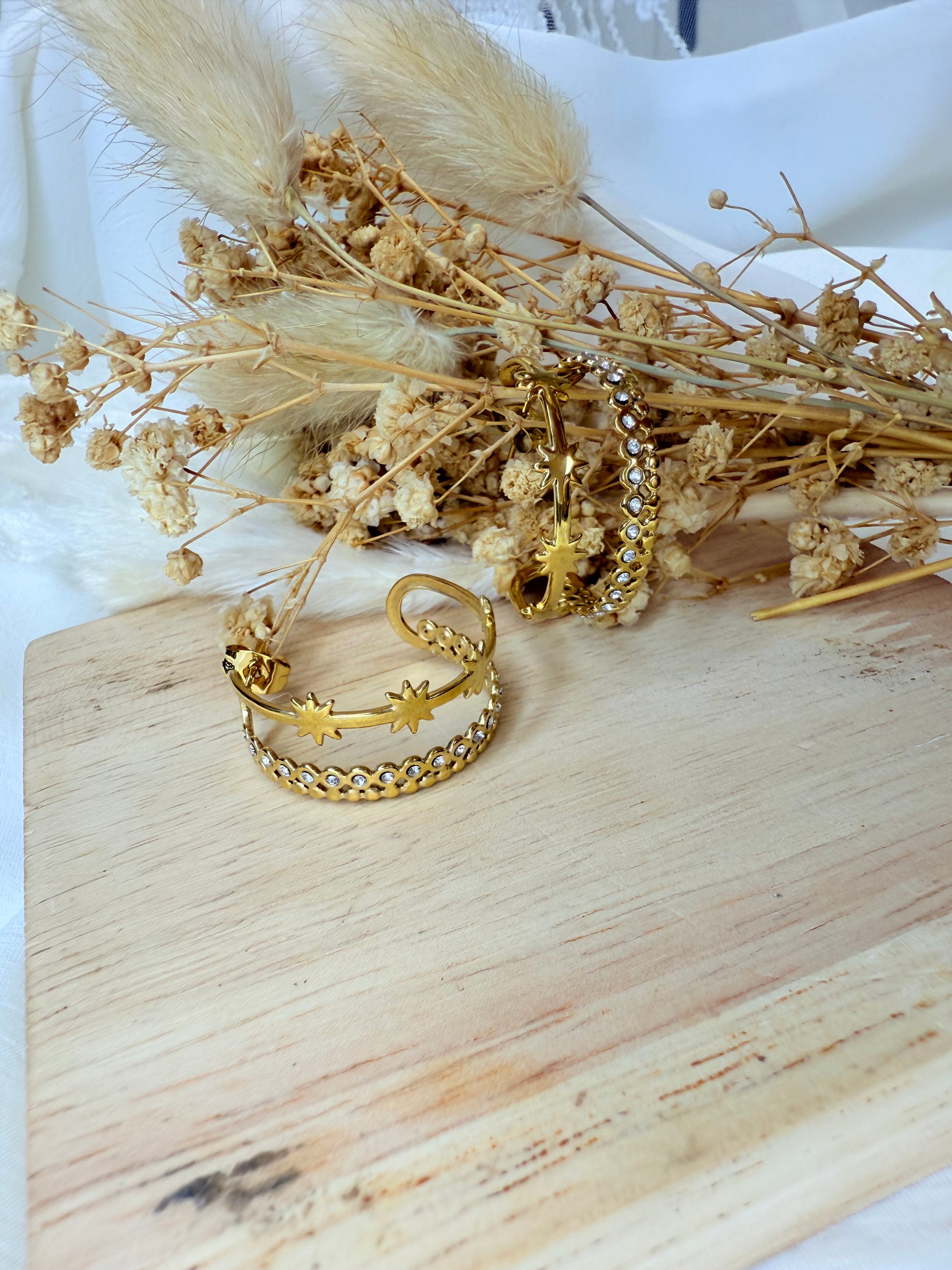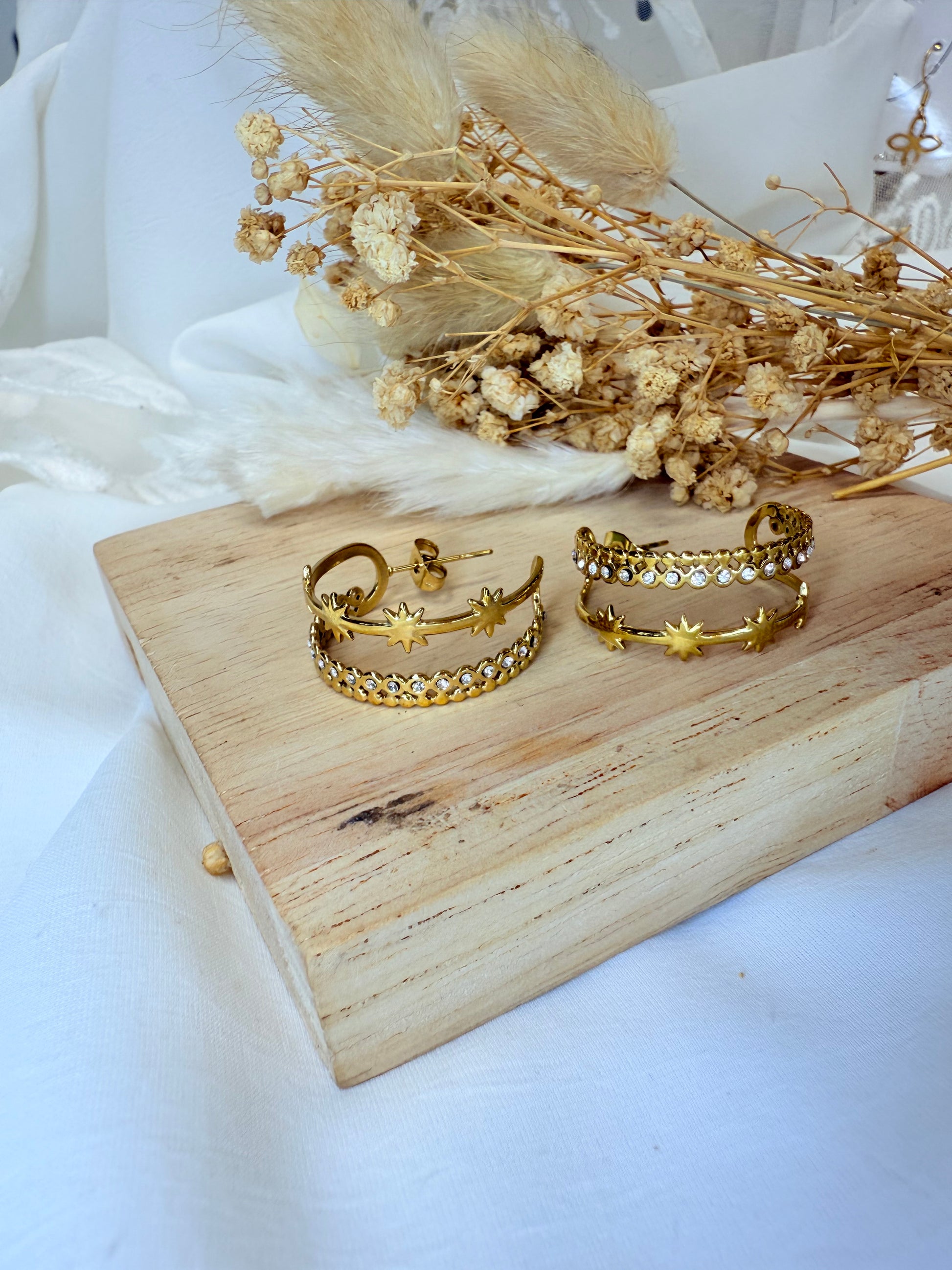 Créoles ouvertes à deux rangs : une partie strassée pour la brillance, l’autre ornée de petites étoile me pour une touche délicate et tendance