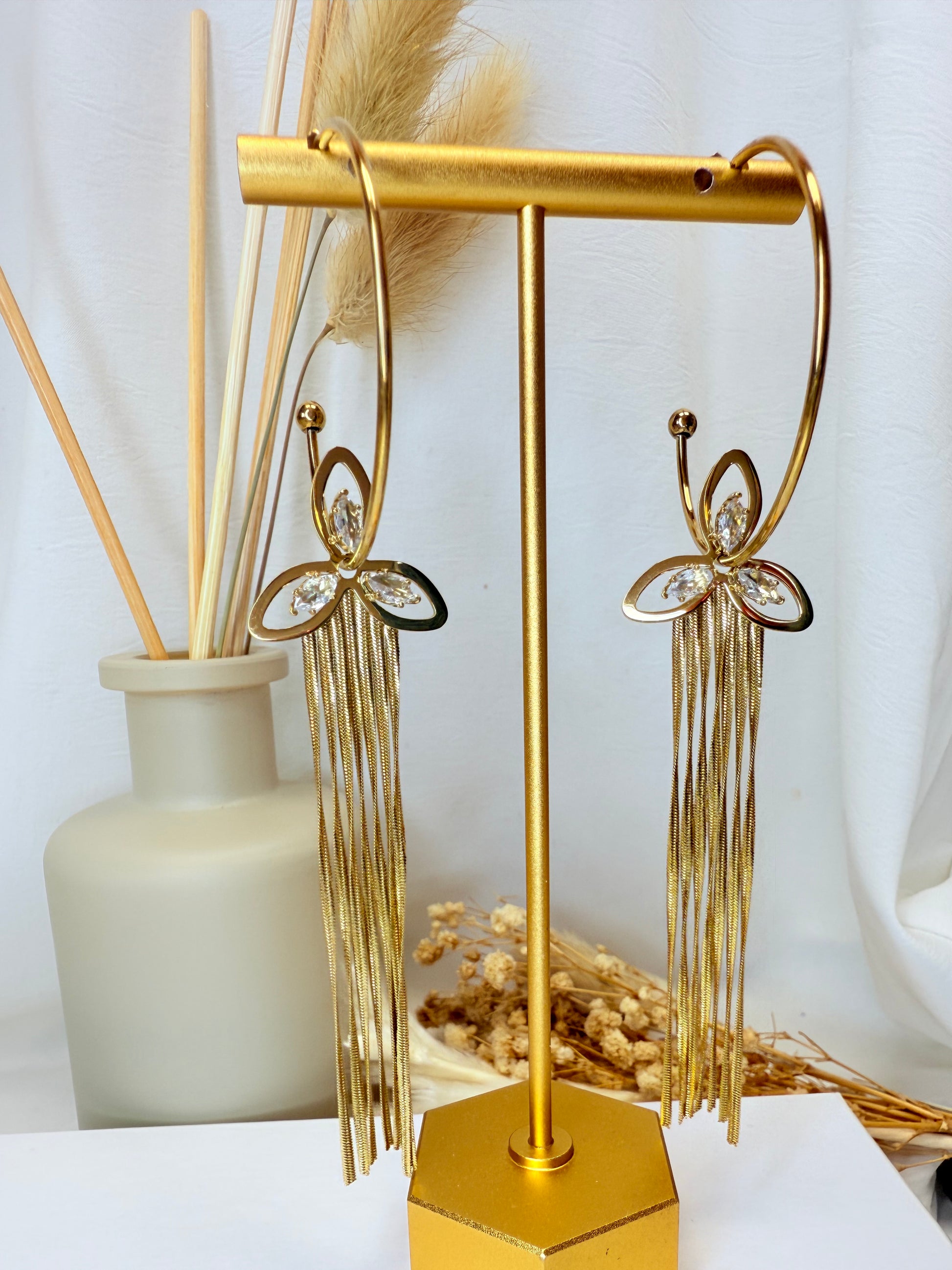 De la fleur s’échappent de fines chaînes pendantes, légères et aériennes, qui accompagnent subtilement le mouvement.
